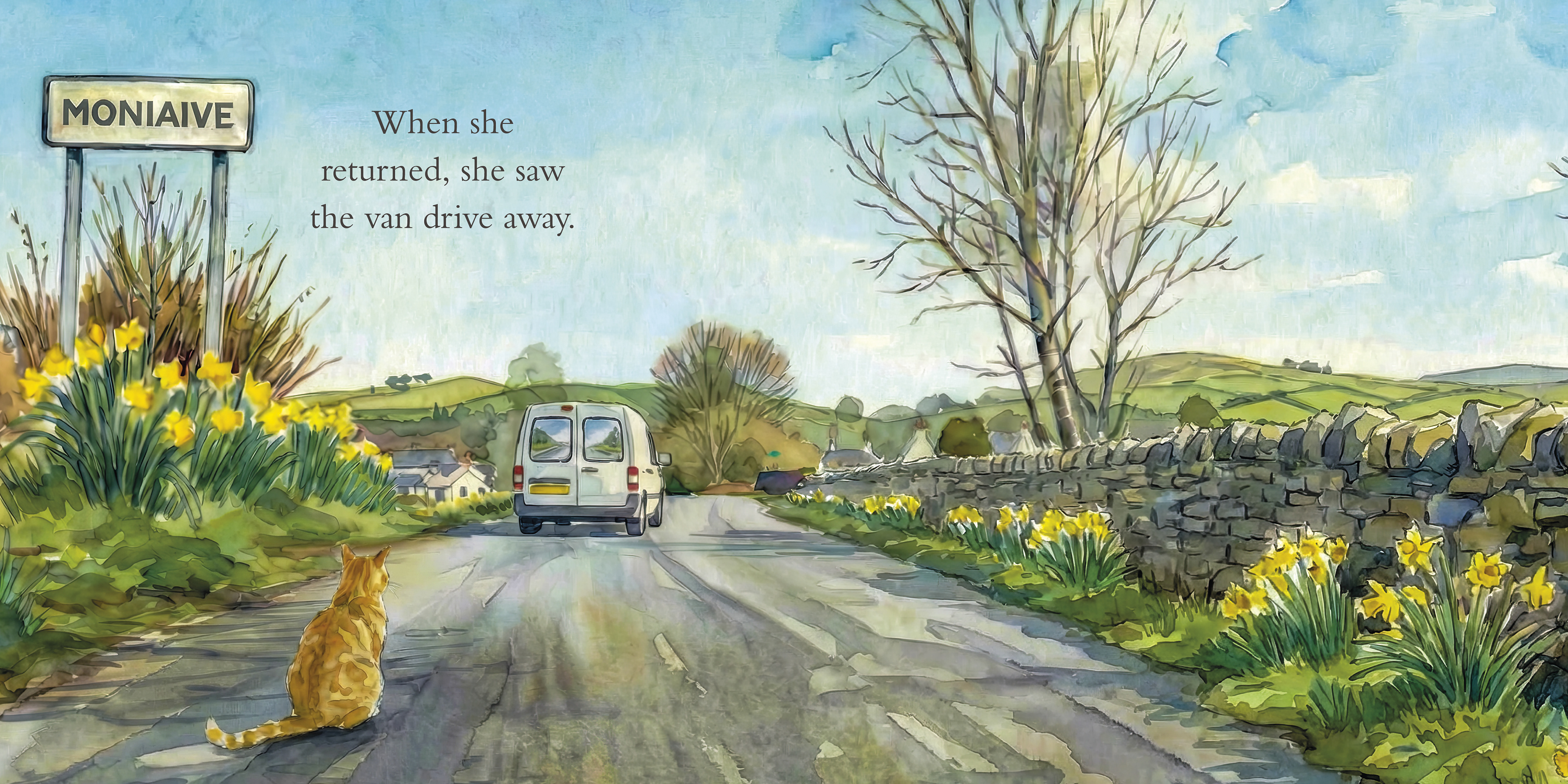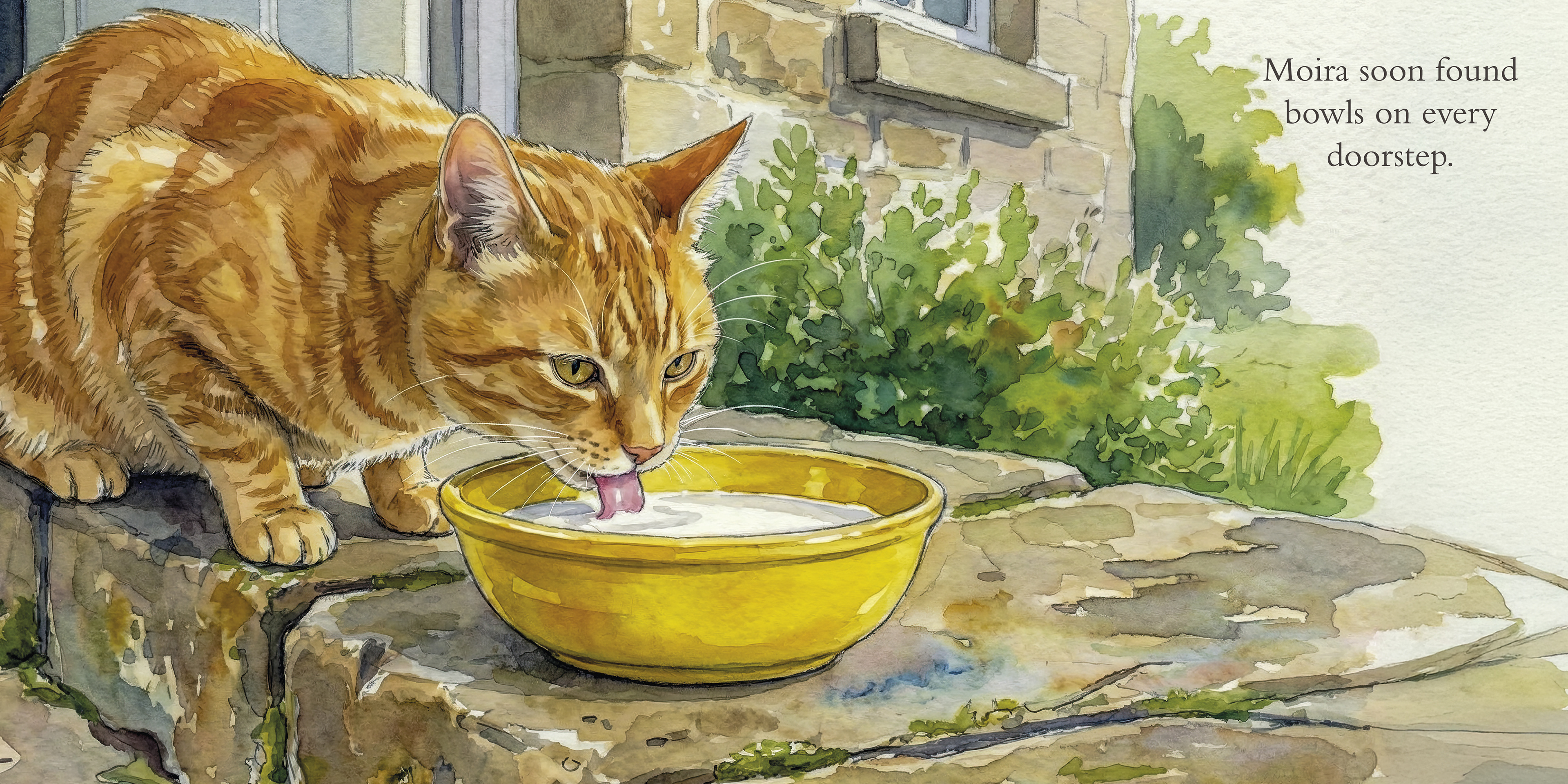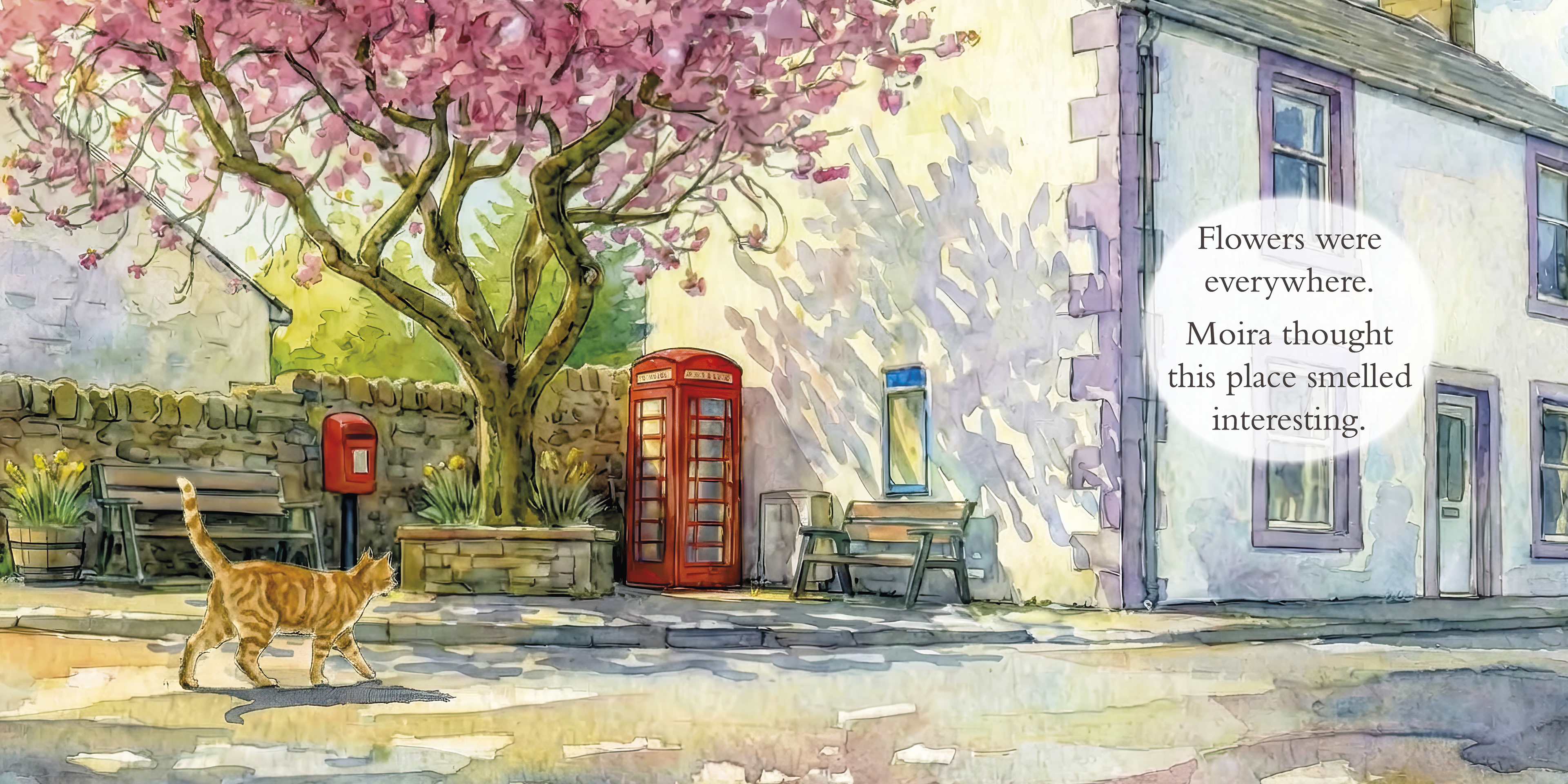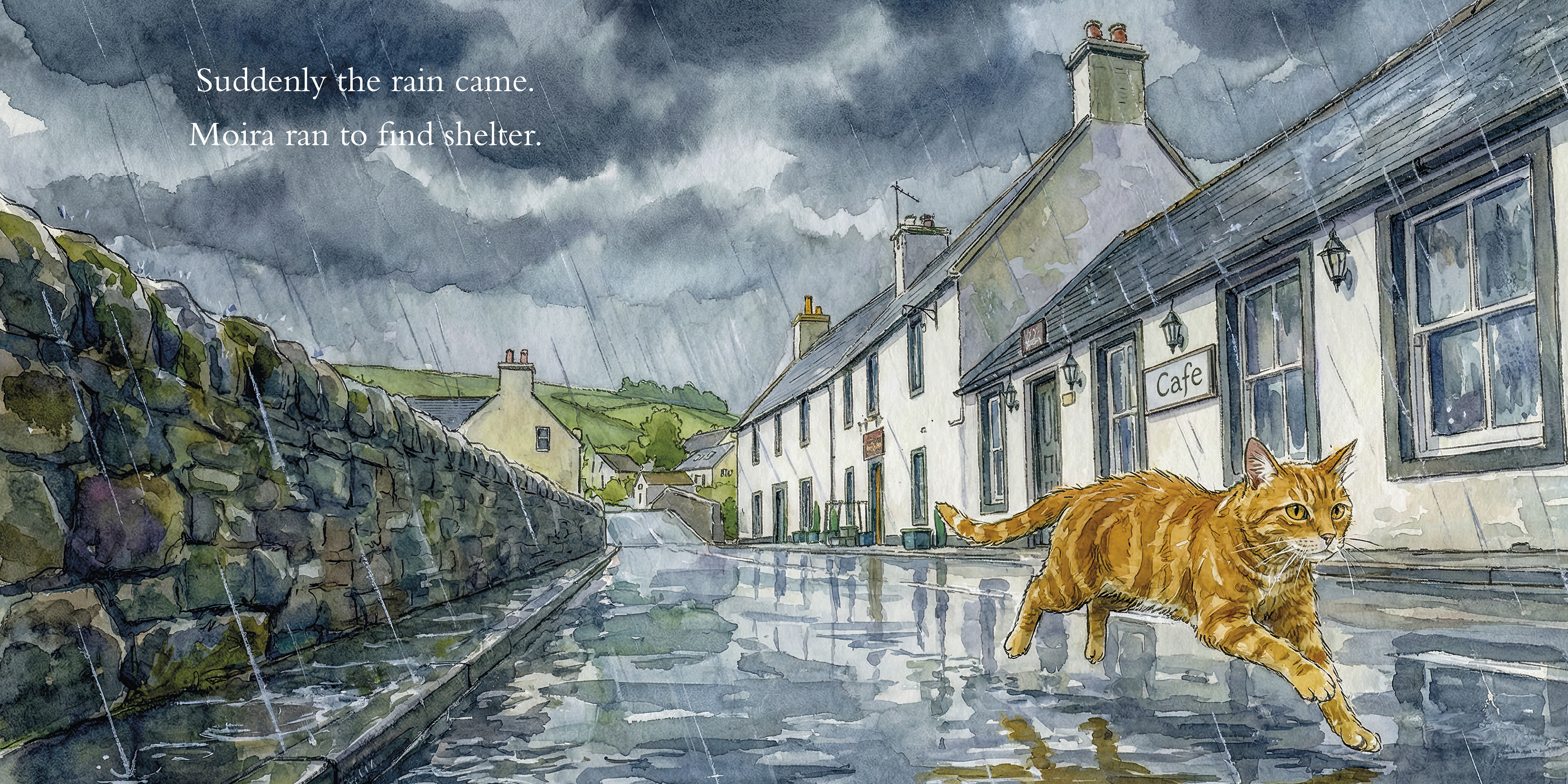 A small selection of spreads from Moira the Moniaive Moggy: Finding Her Place, offering a glimpse of the gentle pacing, watercolour illustrations, and quiet moments that shape Moira’s story.