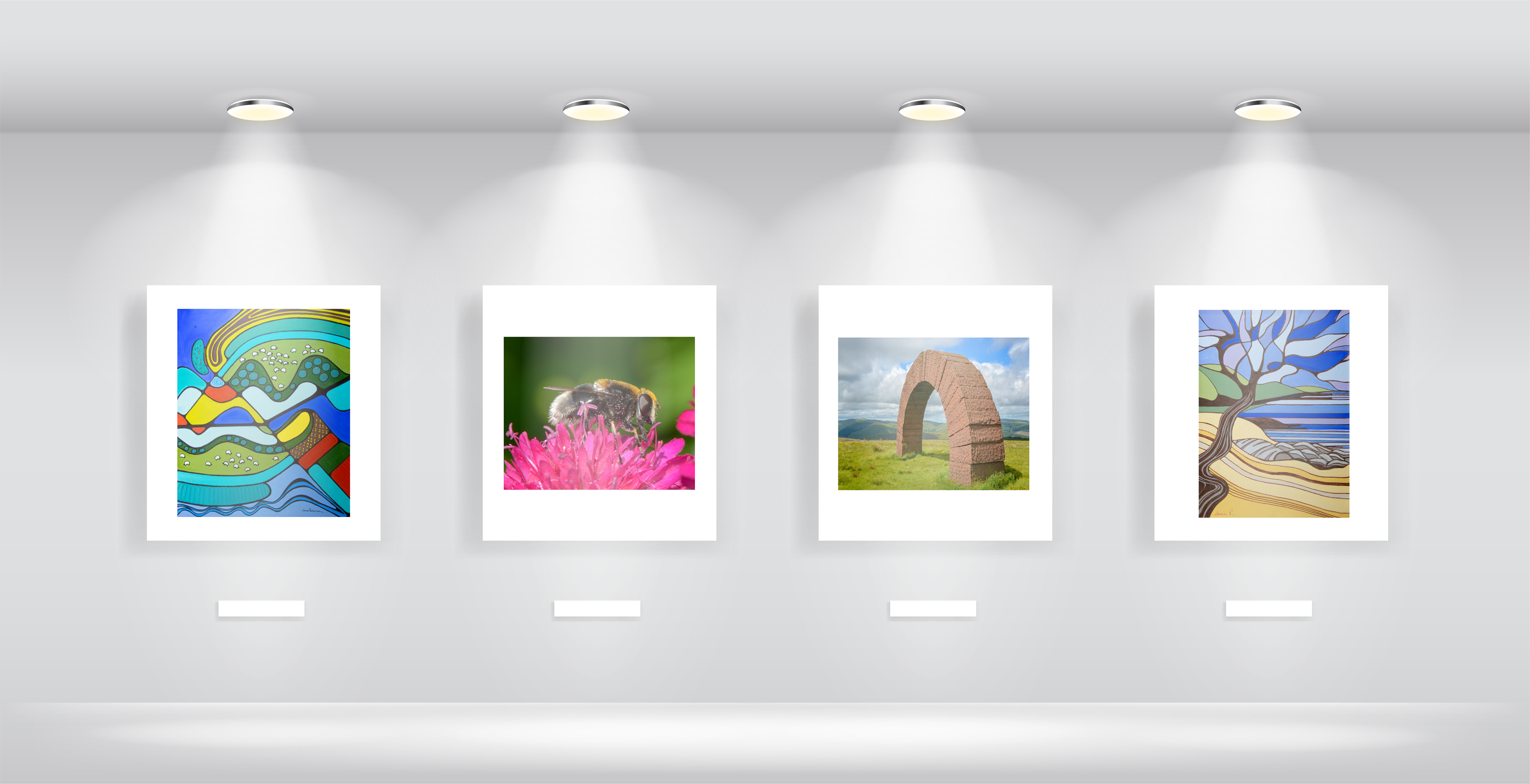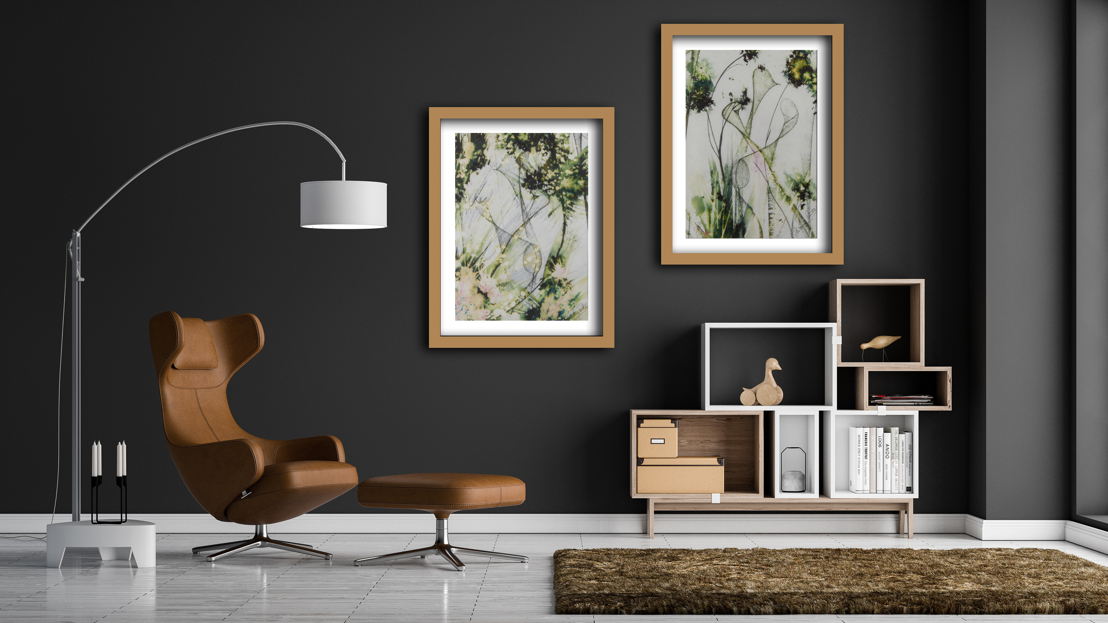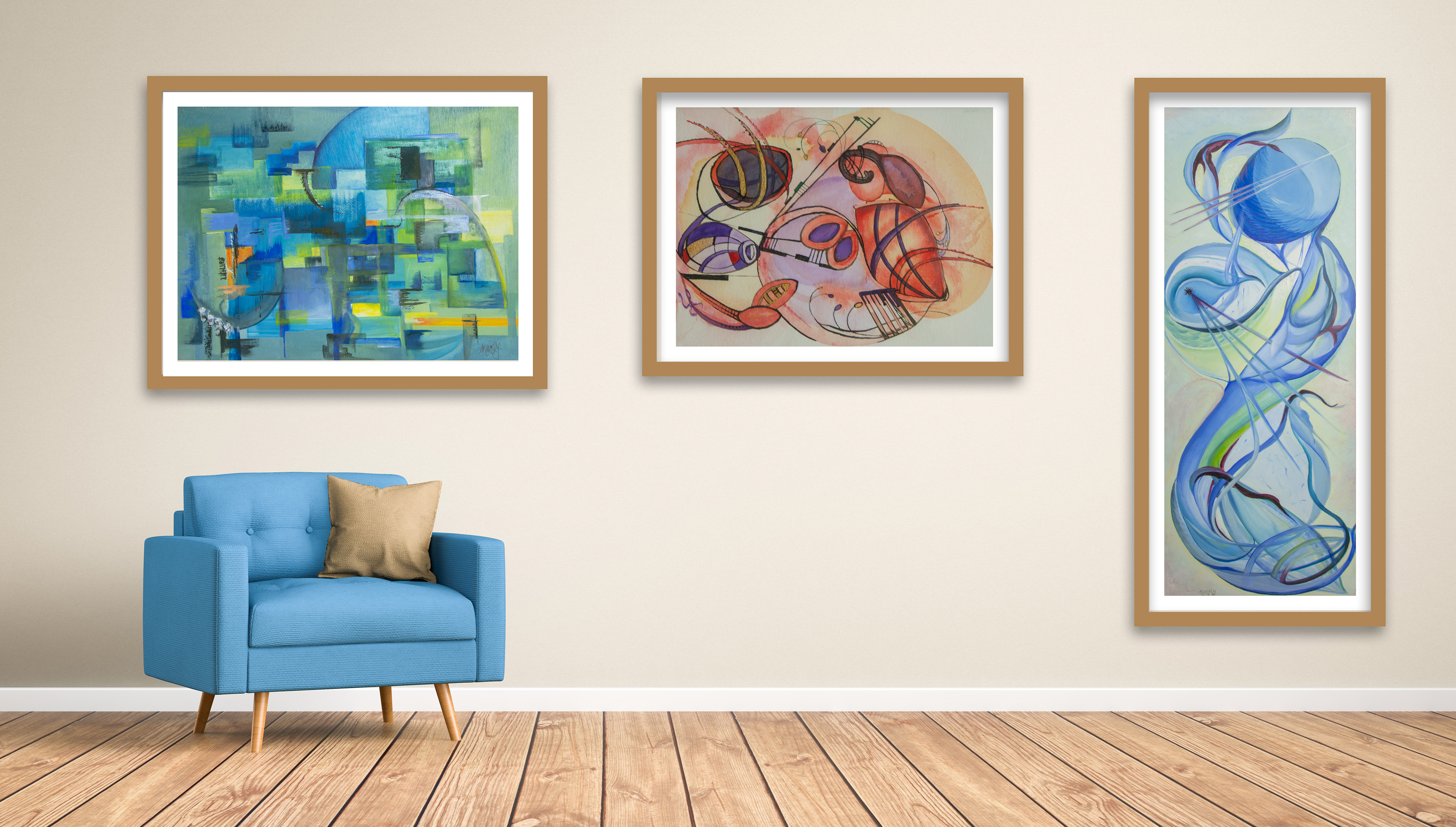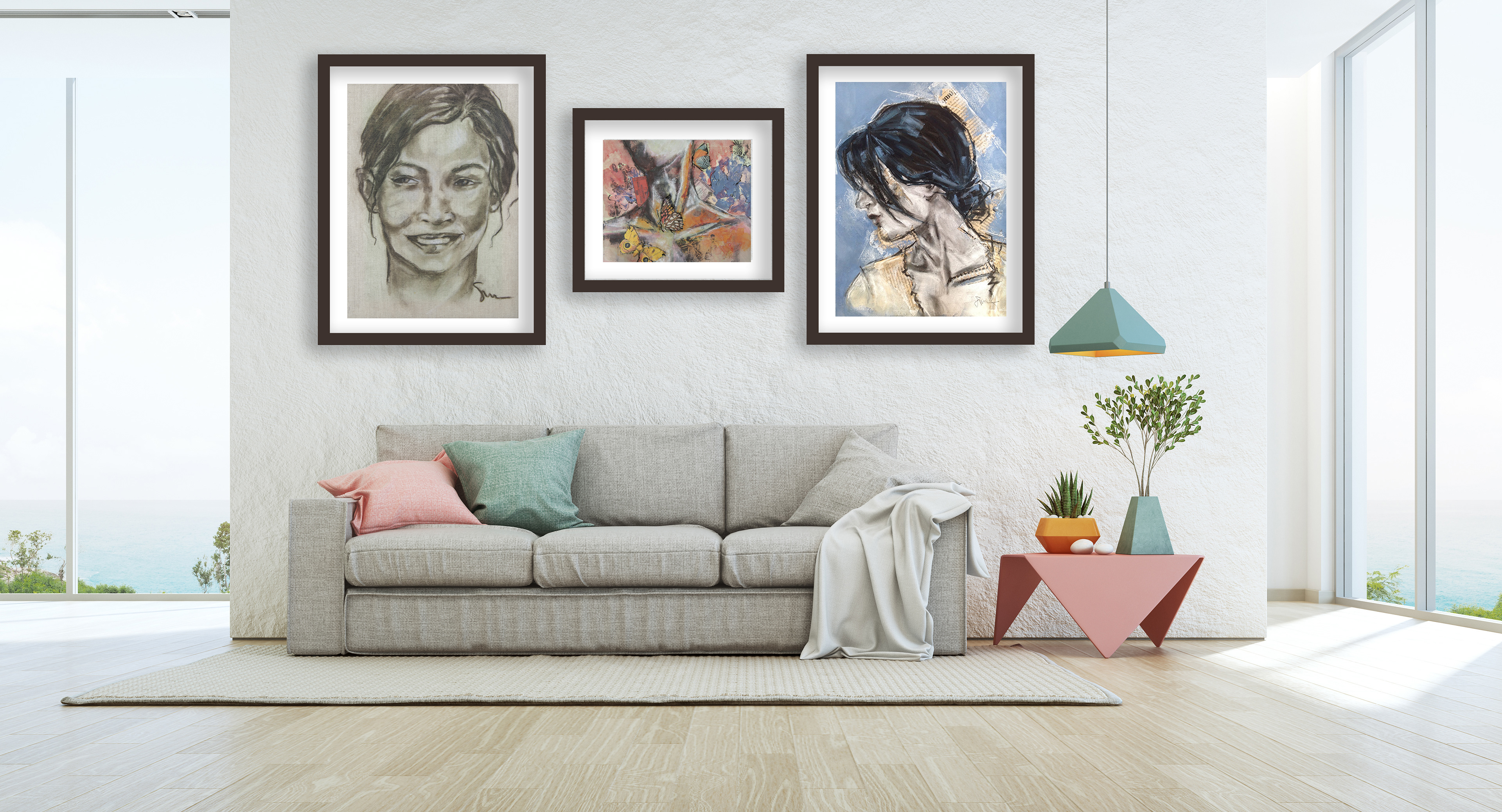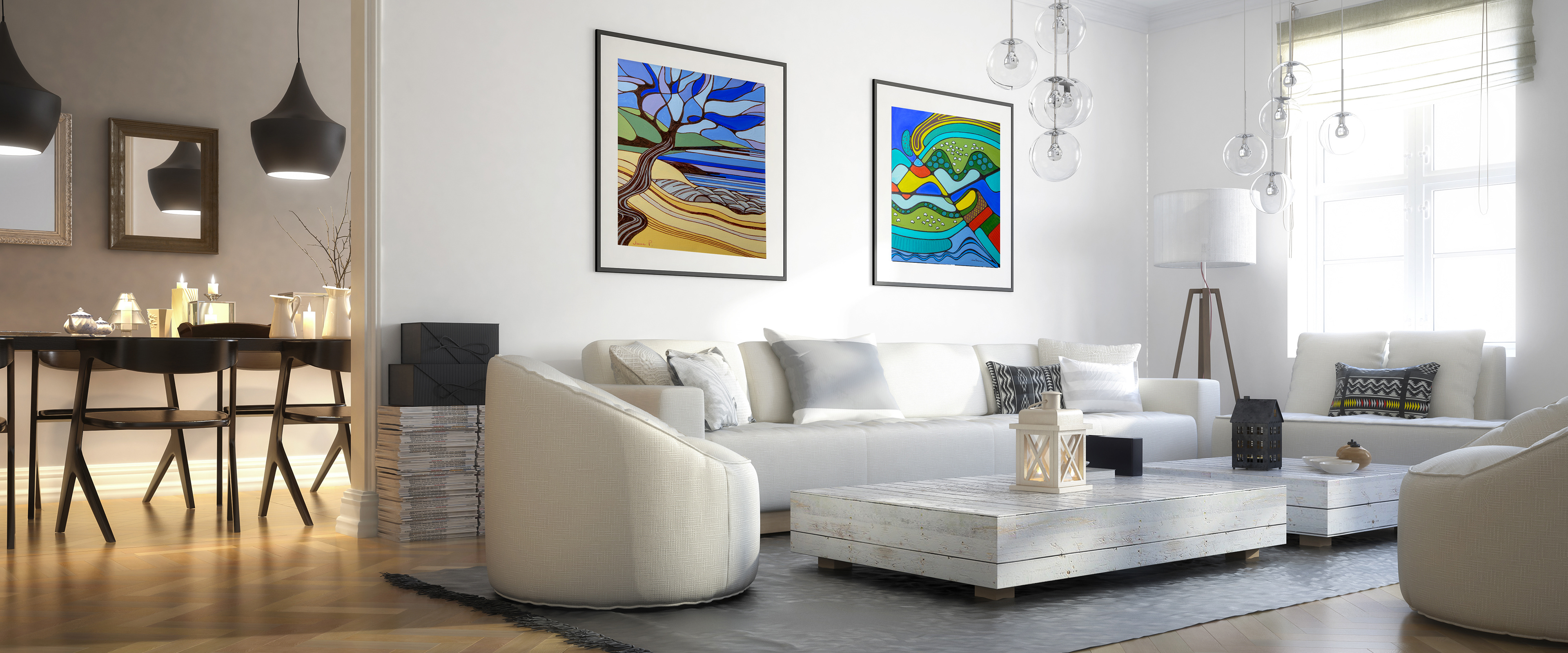 Made with Adobe Photoshop and Illustrator - Mock up living rooms showing Art of local artist work.