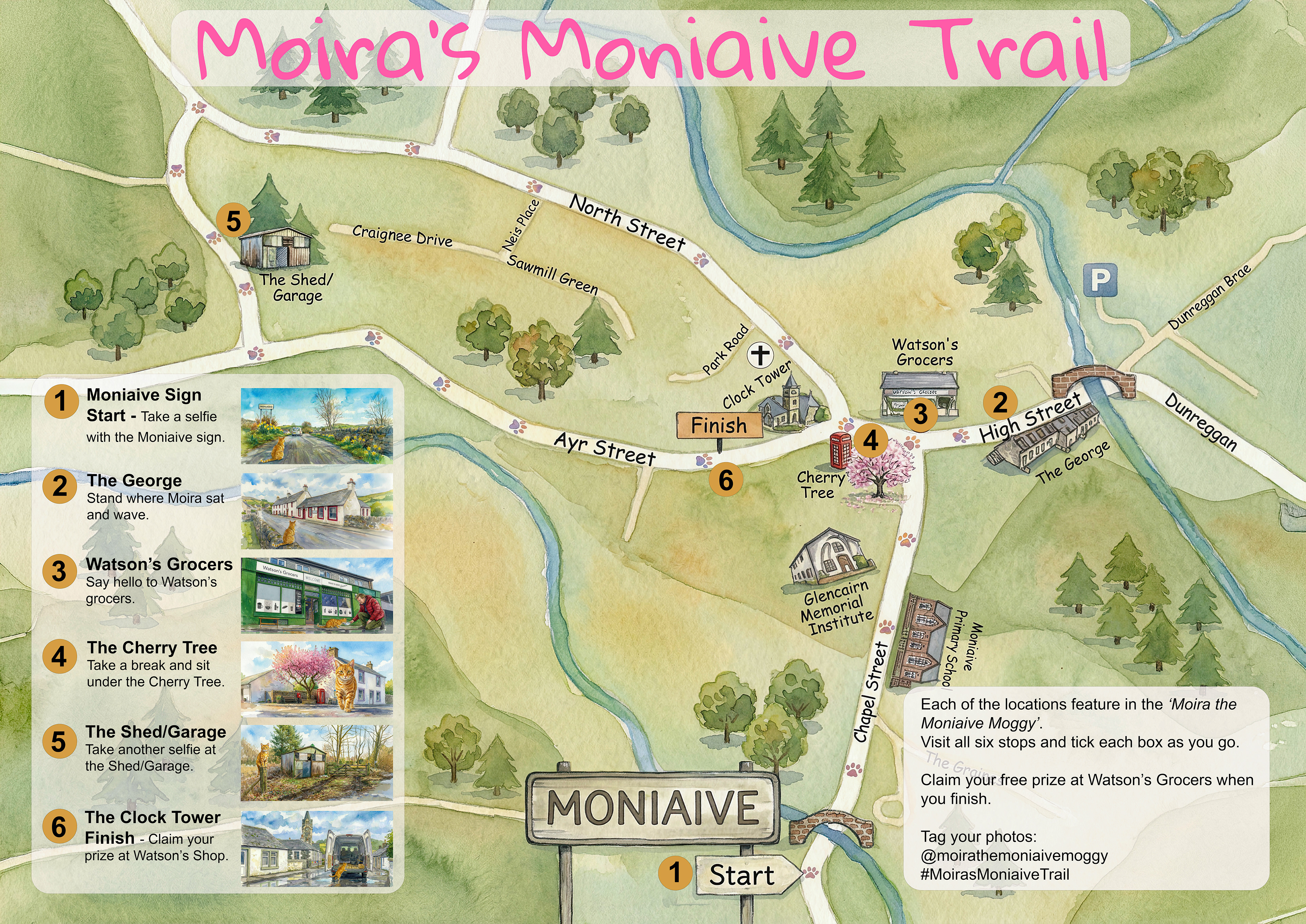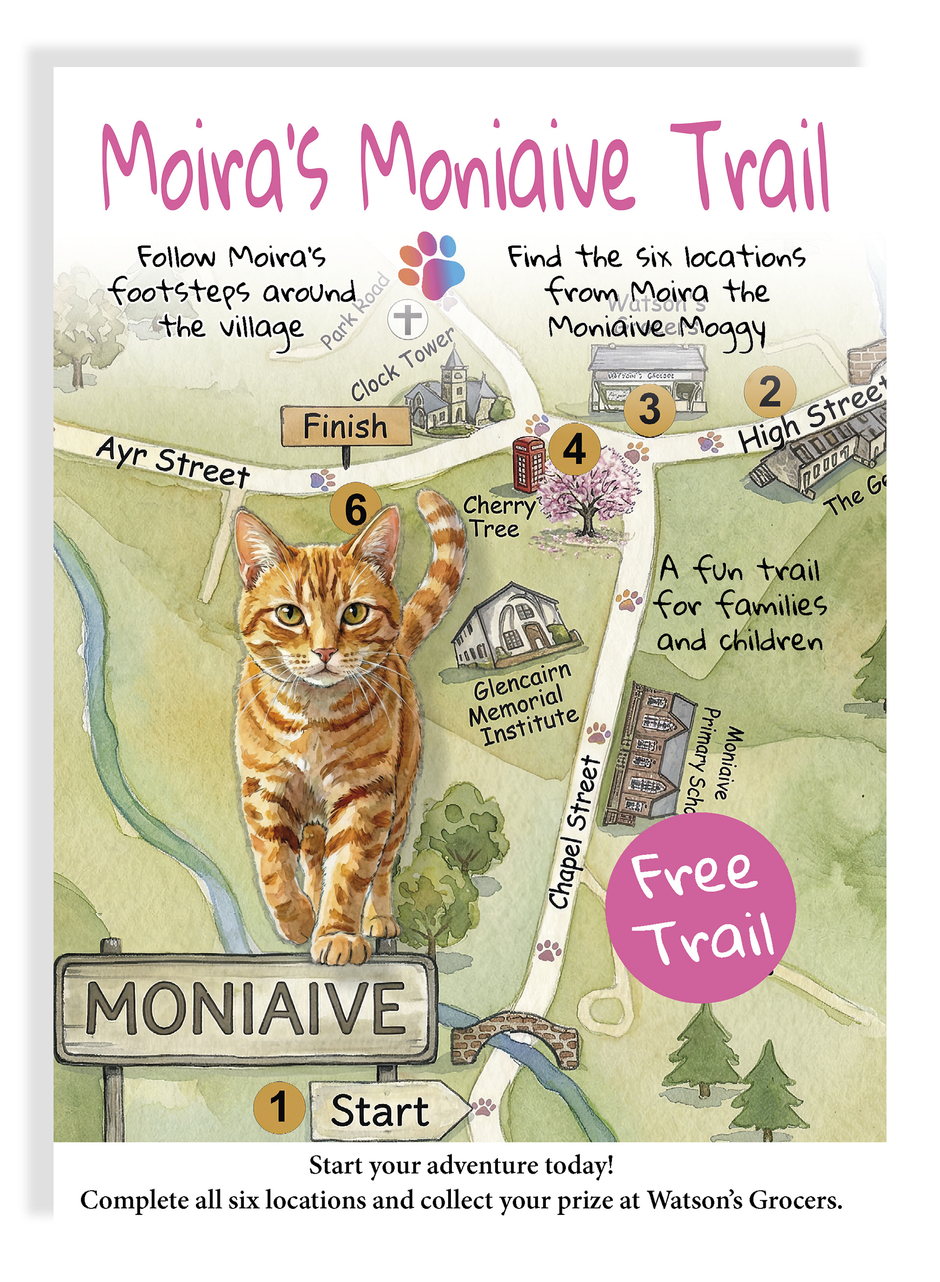 This gentle walking trail follows the real locations featured in Moira the Moniaive Moggy – Finding Her Place. From the Moniaive sign to the Clock Tower, each stop connects a moment from the story with a place you can visit.